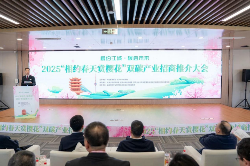 3月20日下午,"相约春天赏樱花"双碳产业招商推介大会在武昌区碳汇大厦隆重举行。作为国内双碳领域的重要盛会,本次活动由湖北省商务厅、武汉市人民政府联合主办。大会以"樱约江城·碳启未来"为主题,汇聚双碳产业领域重点企业、研究机构、投资机构、行业协会代表及政府部门代表近百人,共绘绿色低碳发展蓝图。